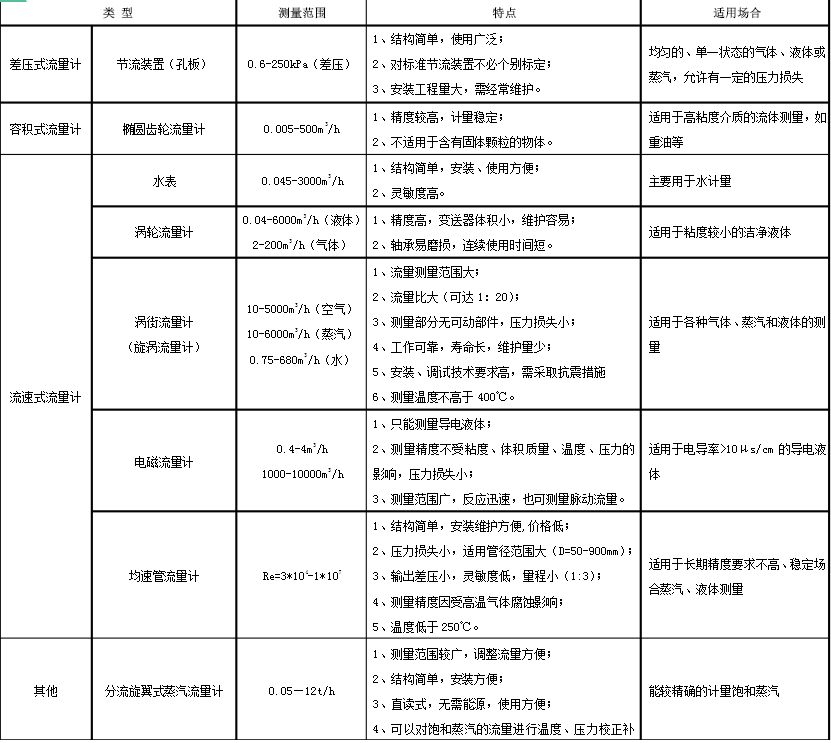 從上述表中,我們可以看出,適用于蒸汽流量測量的只有4種,即節(jié)流裝置(孔板)、渦街流量計(旋渦流量計)、均速管流量計、分流旋翼式蒸汽流量計。?